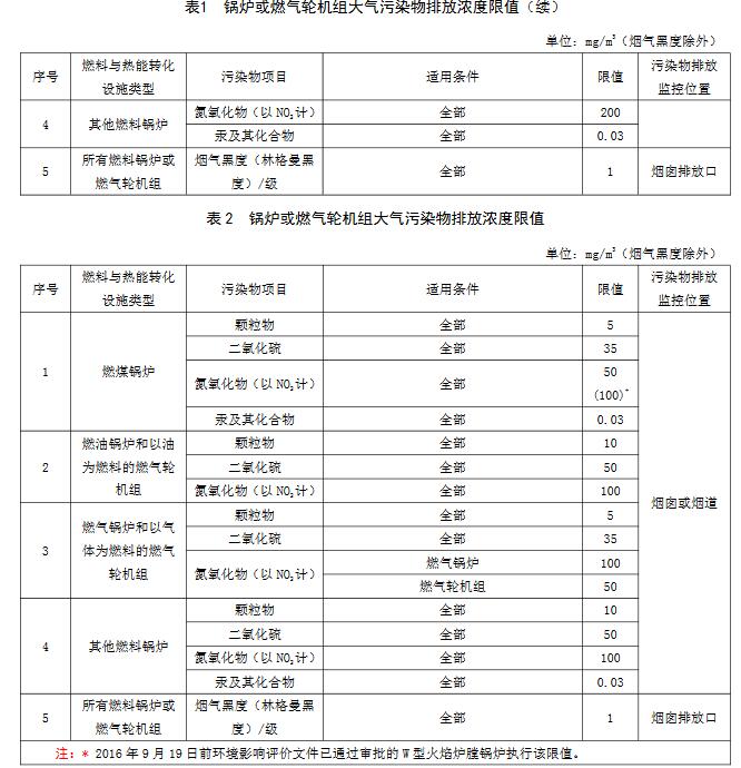4.22016年9月20日起至本標準實施之日前環境影響評價文件通過審批的燃煤鍋爐,2017年1月1日起至本標準實施之日前環境影響評價文件通過審批的燃油鍋爐和以油為燃料的燃氣輪機組、燃氣鍋爐和以氣體為燃料的燃氣輪機組以及其他燃料鍋爐,新建鍋爐或燃氣輪機組,自本標準實施之日起執行表2中的排放濃度限值。