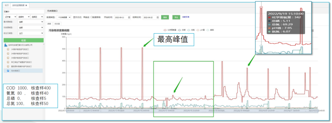 盤錦市生態環境局通過實戰比武,建立與公安前端信息會商機制,發揮各專業和職能優勢對在線監控線索排查和分析研判,實施精準打擊在線數據違法實戰行動。2022年9月執法人員對在線數據異常線索深入調查中發現,某石化有限公司污染源監控平臺污染物濃度歷史數據曲線圖明顯異常。梳理線索后,執法人員會同公安機關立即以“四不兩直”的方式進行現場檢查。通過現場檢查發現,該企業存在出現故障不能及時維護到位,導致儀器長時間不能正常運行檢測等8項不正常運行自動監控設施問題。經過現場手工監測比對分析,多項監測數據比對結果超出標準范圍。目前,轄區執法大隊已對存在環境問題立案調查。