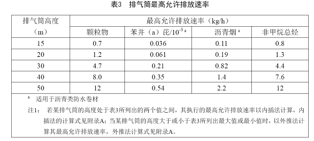 排氣筒中污染物排放除應符合表1最高允許排放濃度外,還應同時滿足表3規定的排氣筒高度對應的最高允許排放速率要求。