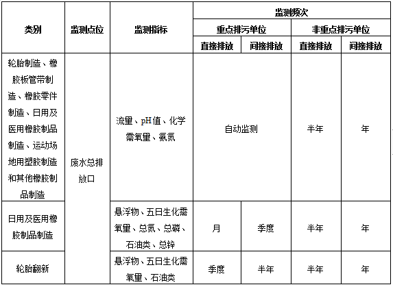 橡膠制品工業排污單位廢水排放監測點位、監測指標及最低監測頻次按照表1執行。
