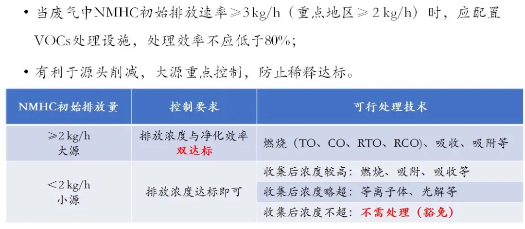 VOCs去除處理:收集的廢氣中NMHC初始排放速率<2 kg/h時(shí),收集后濃度不超、可豁免VOCs處理,濃度達(dá)標(biāo)即可。