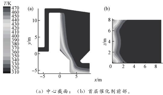 圖9所示為反應器(方案3)中心截面及首層催化劑前部的溫度場分布云圖。