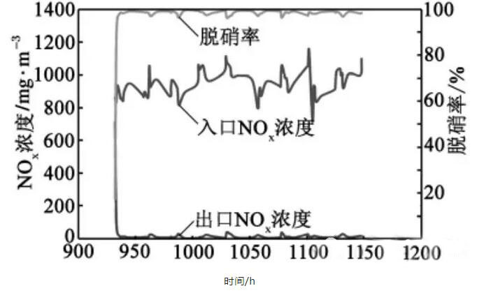 使用該類型的催化劑即使在入口NOx濃度很高時(2000~3000mg/m3),也可達到很高的NOx脫除精度,反應后尾氣中氮氧化物濃度可低于150 mg/m3。如排放標準進一步升級,不需對催化劑和反應裝置做任何改動,只需稍微增加氨投入量,提供反應所需的氨量,即可使尾氣中NOx濃度小于所規定的排放限值。