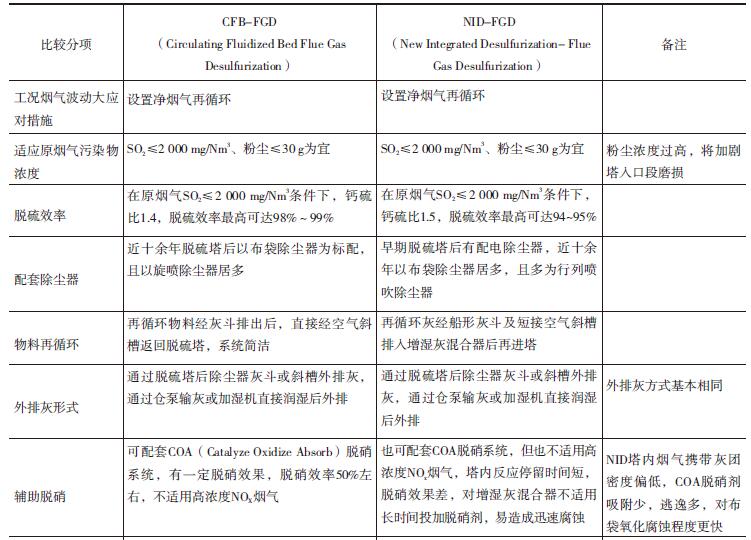 煙氣循環(huán)流化床CFB-FGD、 NID-FGD兩種半干法脫硫除塵治理工藝技術(shù)體系對(duì)比見表1。