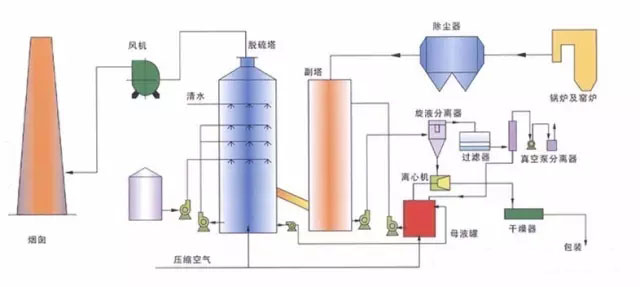 復合式脫硫塔工作時煙氣由引風機鼓入脫硫塔內,在脫硫塔徑向進風管內設有第一級噴淋裝置,對煙氣進行預降溫和預脫硫,經過降溫和預脫硫的煙氣由脫硫塔中下部均勻上升,依次穿過三級噴淋裝置形成的高密度噴淋洗滌反應區和吸收反應區,脫硫液通過螺旋噴嘴生成極細的霧滴為煙氣與脫硫液的充分混合提供了巨大的接觸面積,使得氣液兩相進行充分的傳質和傳熱的物理化學反應,從而達到SO2的高效脫除。脫硫塔內置有兩級脫水除霧裝置,經過脫硫后的煙氣繼續上升,依次經過兩層折板除霧裝置,通過霧氣、小液滴在折板處的多次撞擊形成較大液滴,大液滴與煙氣分離后下落,脫水后的煙氣通過煙道至煙囪排放。
